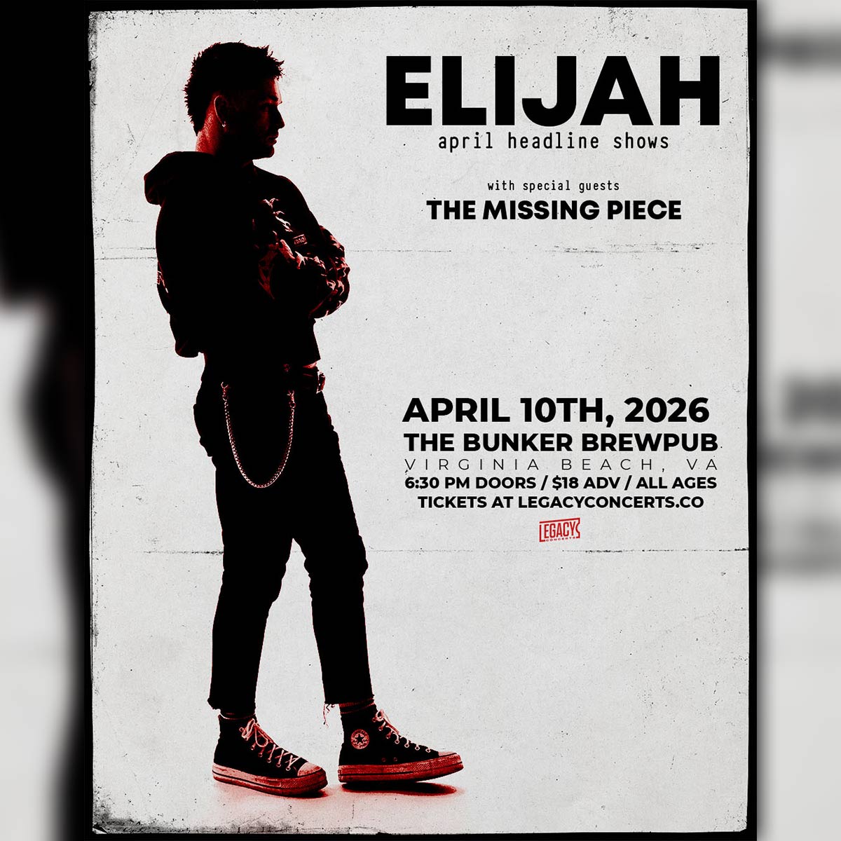 Fri Apr 10 Elijah with The Missing Peace Doors: 6:30 PM | Show: 7:30 PM The Bunker Brewpub Virginia Beach, VA All Ages TICKETS