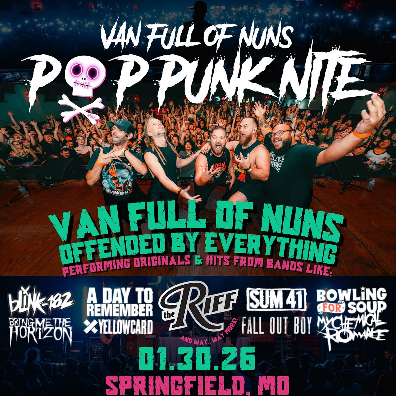 Fri Jan 30 Van Full of Nuns Presents Pop Punk Nite with Offended By Everything Doors: 7:30 PM | Show: 8:15 PM The Riff Springfield, MO All Ages TICKETS
